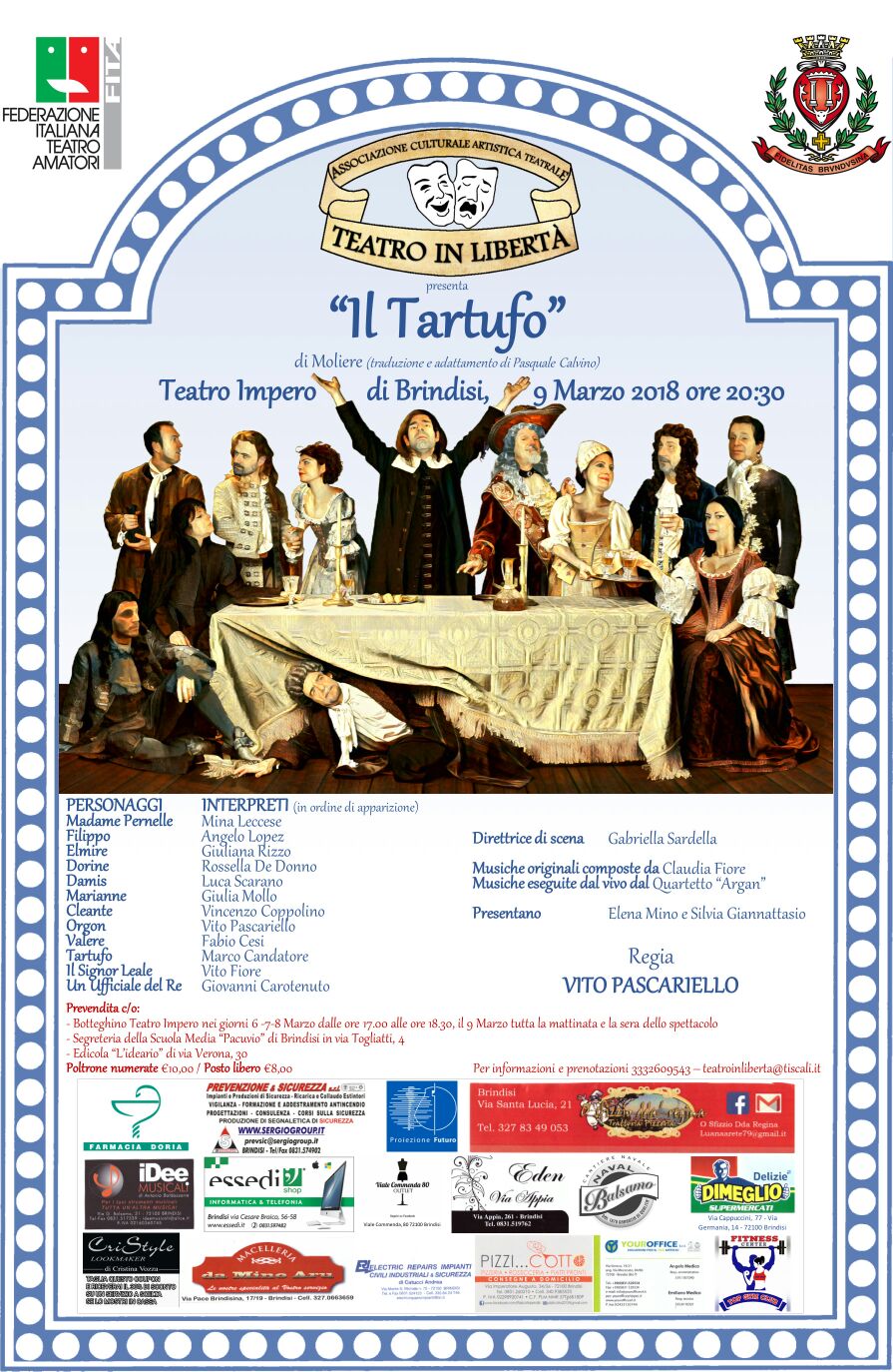 “Il Tartufo”, un capolavoro sull’ipocrisia mette in scena una satira dissacrante e irriverente verso la bigotteria, i falsi perbenismi e i vizi di chi si crede depositario di ogni virtù. E’ stata tra le commedie di Moliere quella che più ha rischiato di non essere rappresentata ai suoi tempi. Re Luigi XIV, infatti, dopo la “prima” ne proibì le repliche per non attirarsi le ire della Cabala dei Devoti (Potente associazione sorta allo scopo di ravviare la devozione e di sorvegliare i costumi).